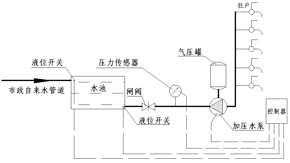 2、壓力/水位穩(wěn)定。系統(tǒng)配置的小型氣壓罐/液位開關(guān)能保證用水高峰期管道壓力穩(wěn)定和水池水位。