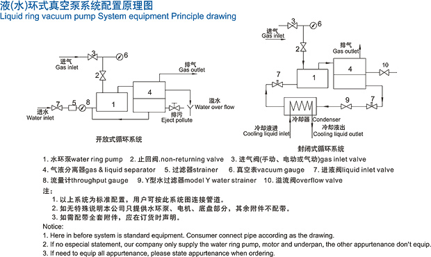 本公司液水環(huán)式真空泵可提供以下選擇: 1、根據(jù)真空度的不同可選擇: ●在1.3×104~1×105 Pa(100~760 Torr) 區(qū)間長期運(yùn)轉(zhuǎn),選用單級SK型水環(huán)式真空泵。 ●在5×103~1.3×104Pa(40~100Torr)區(qū)間長期運(yùn)轉(zhuǎn),選用雙級2YK型水環(huán)式真空泵。 ●在1×103~1.3×104Pa(8~40Torr)區(qū)間長期運(yùn)轉(zhuǎn),選用2YK型雙級油環(huán)真空泵。 2、工作介質(zhì)可選擇: ●常溫水,以≤15℃為佳,一般不得高于40℃ ●變壓器油或其它粘度低飽和蒸汽壓低的工業(yè)油,高適用溫度60℃。如電工行業(yè)真空干燥。 ●化工液體,直接選用化工原料,要求飽和蒸汽壓低的液體,如乙醇胺等。 ●除常溫水外,選用其它工作介質(zhì)應(yīng)配置氣液分離器、冷卻器等,泵軸動(dòng)密封應(yīng)采用機(jī)封。詳細(xì)性能參數(shù)見性能表。 3、軸動(dòng)密封選擇: ●一般使用場合可選用盤根密封。 ●要求無泄漏使用場合應(yīng)選用機(jī)封。 4、過流零件材質(zhì)選擇: ●除軸外,其余零件均為鑄鐵或銅合金,適用于抽吸無腐蝕性的氣體。 ●304和316不銹鋼。適用于抽吸含一定腐蝕性氣體。 ●工程塑料,適用于抽吸含酸性的腐蝕性氣體。 5、如需一邊抽真空一邊輸送氣體,排氣口壓強(qiáng)超過大氣壓時(shí)可根據(jù)以下方案選擇: ●如排氣口壓強(qiáng)大于0.15MPa,不得用真空泵改裝,應(yīng)選用專門的雙級液環(huán)壓縮機(jī)。配套電機(jī)功率應(yīng)增大,應(yīng)配套專門的氣液分離器及自動(dòng)排水裝置。 ●如排氣口壓強(qiáng)高于大氣壓而低于0.15MPa時(shí),可用真空泵改裝為液環(huán)壓縮機(jī)使用。 6、系統(tǒng)配置型式 ●當(dāng)排出口工作液不回用或只有部分回用,采用開放式循環(huán)系統(tǒng)。 ●當(dāng)排出口工作液必須回用不得外排時(shí),應(yīng)采用封閉式循環(huán)系統(tǒng)。
