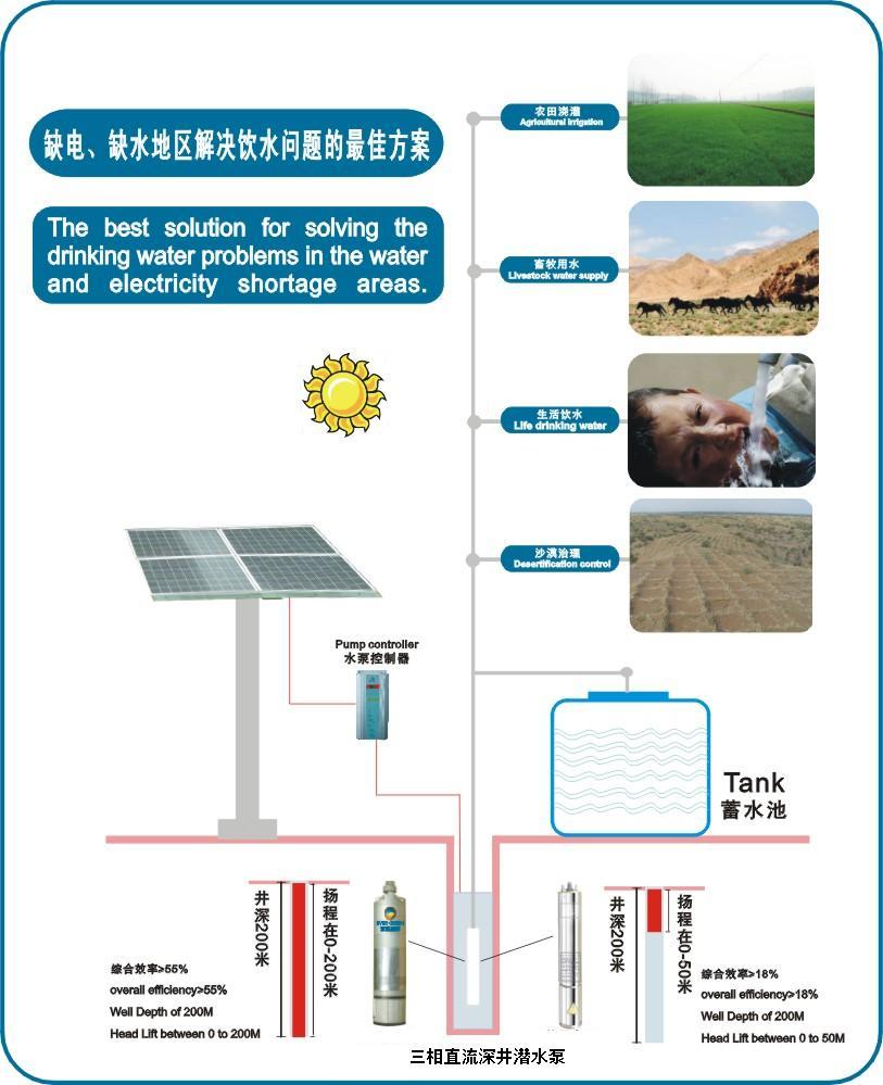直流太陽能水泵主要用于村莊或戶用供水、牲口飲水及農場灌溉、野外宿營供水、邊遠無電地區(qū)供水、降低地下水位、增壓及各種工業(yè)用途;可以在小直徑4英寸的管道井或開口中使用, 也可以在各種湖泊、水塘和河渠等水源中取水。