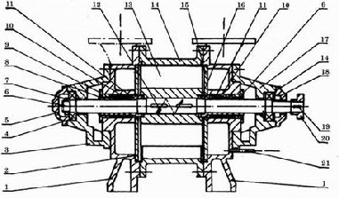 1.端蓋 2.排氣園盤 3.后軸承架 4.軸承 5.后軸承城市蓋 6.軸 7.園螺母 8. 后軸套 9. 填料壓蓋 10.填料壓圈 11.填料 12.平鍵 13. 葉輪 14.泵體 15.吸氣園盤 16.前軸套 17.前軸承架18.前軸承壓蓋 19.平鍵 20.聯(lián)軸器 21.進(jìn)水管 | ||||||||||||||||||||||||||||||||||||||||||||||||||||||||||||||||||||||||||||||||||||||||||||||||||||||||||||||||||||||||||||||||||||