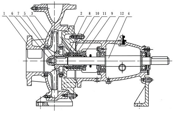 IS、IR型泵系根據(jù)國家標準ISO2858所規(guī)定的性能和尺寸設(shè)計的,主要由泵體(1)、泵蓋(2)、葉輪(3)、軸(4)、密封環(huán)(5)、軸套及懸架軸承部件(12)等所組成。