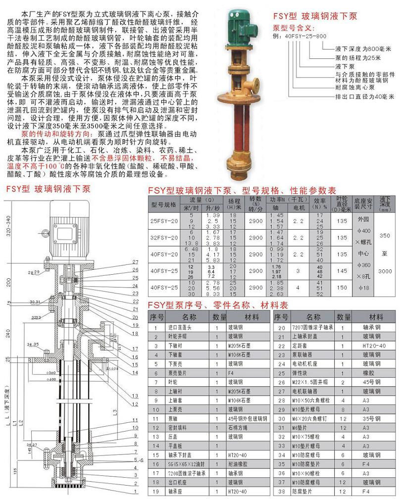 玻璃鋼(酚醛樹脂)對非氧化性酸(鹽酸、稀硫酸、磷酸等)、鹽類溶液、水都有良好的耐蝕性,不耐堿和氧化性酸(硝酸、鉻酸等)的腐蝕,高耐溫度約為120~150℃,低溫度為-20℃。本單位應用此材料生產(chǎn)的SY型立式玻璃鋼液下泵、WSY型泵為立式玻璃鋼液下旋渦泵、FSY型泵為立式玻璃鋼液下離心泵。該泵因伸入貯罐,貯槽的深度長短不同,設計液下深度500mm--3000mm之間任意選擇。只要液體高于泵體,即可不灌液而起動送液,平蓋板下設有泄漏孔,液體不會向貯罐外泄漏。