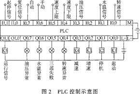 圖2為智能型柴油機(jī)泵組自動(dòng)控制部分硬件線路電路圖。智能控制器采用德國(guó)西門子的S7—200系列產(chǎn)品,各種輸入信號(hào)通過開關(guān)按鈕及相關(guān)傳感器從現(xiàn)場(chǎng)采集。輸出信號(hào)通過各種執(zhí)行器控制柴油機(jī)的運(yùn)行狀態(tài)。