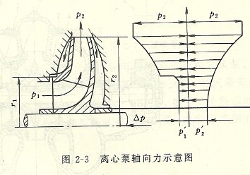 液體以低壓進入葉輪,而在高壓下流出葉輪,也就是說,葉輪人口處液體的壓力較低,葉輪背側(cè)的壓力較高,而且由于葉輪前后蓋板形狀的不對稱,使得葉輪兩側(cè)受到的液體壓力不相等,因而產(chǎn)生了軸向推力,如圖2-3所示。這個軸向推力作用在葉輪上,通過葉輪螺母傳遞到整個轉(zhuǎn)子上,使泵的整個轉(zhuǎn)子發(fā)生向葉輪吸人口方向的竄動,引起泵的振動,軸承發(fā)熱,甚至損壞零件。為避免軸向推力的不良影響,圖2 2所示