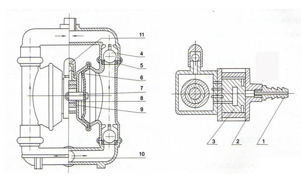 1 進(jìn)氣口 2 配氣閥體 3 配氣閥 4 圓球 5 球座 6 隔膜 7 連桿 8 連桿銅套 9 中間支架 10 泵進(jìn)口 11 排氣口