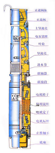 2、潛水泵每級導(dǎo)流殼中裝有一個橡膠軸承;葉輪用錐形套固定在泵軸上;導(dǎo)流殼采用螺紋或螺栓聯(lián)成一體。
