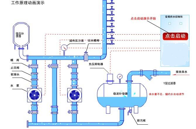 2.變頻泵的進(jìn)水口與不銹鋼穩(wěn)流補(bǔ)償器相連,微機(jī)系統(tǒng)檢查穩(wěn)流補(bǔ)償器內(nèi)的壓力,當(dāng)壓力降到零壓時(shí),安裝在穩(wěn)流補(bǔ)償器內(nèi)上方外部的真空自動(dòng)抑制器就會(huì)自動(dòng)打開穩(wěn)流補(bǔ)償器內(nèi)外空氣通道開通,通過進(jìn)水壓力檢測(cè)和真空自動(dòng)抑制器來保證穩(wěn)流補(bǔ)償器內(nèi)不產(chǎn)生負(fù)壓,從而保證自來水管網(wǎng)的正常供水。