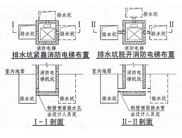用于消防電梯井排水坑的潛水排污泵安裝方式,應(yīng)采用2臺硬管鏈接固定式安裝或2臺固定式自耦式安裝,且排水坑有效容積不小于2.0m3,潛水排污泵的額定流量不小于36m3/h.消防電梯排水坑的平面布置可參照下列形式確定。
