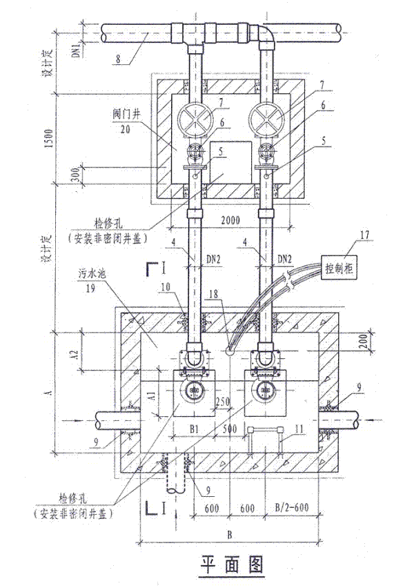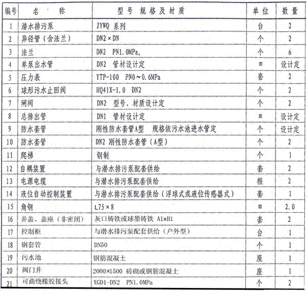 4.潛水排污泵控制柜安裝位置由單項(xiàng)工程設(shè)計考慮,其型號規(guī)格可由泵廠配套供應(yīng)。池外電線電纜應(yīng)穿管敷設(shè)。