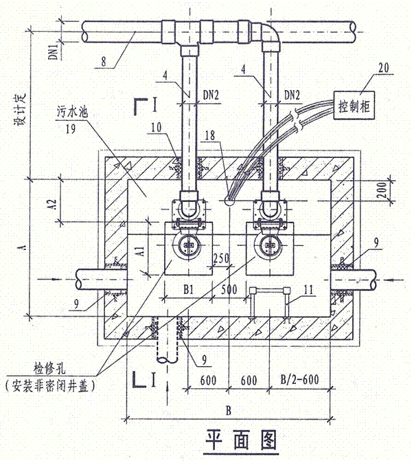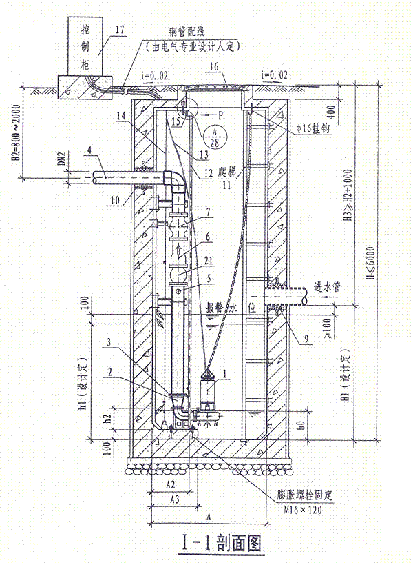 4.潛水排污泵控制柜安裝位置由單項(xiàng)工程設(shè)計(jì)考慮,其型號(hào)規(guī)格可由泵廠配套供應(yīng)。池外電線電纜應(yīng)穿管敷設(shè)。
