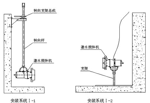 安裝系統(tǒng)Ⅰ只適用池深<4m,機型為QJB0.85/8-260/3-740C和QJB1.5/6-260/3-980C攪拌機,其中Ⅰ-1可在水平方向和垂直方向進行調(diào)節(jié);