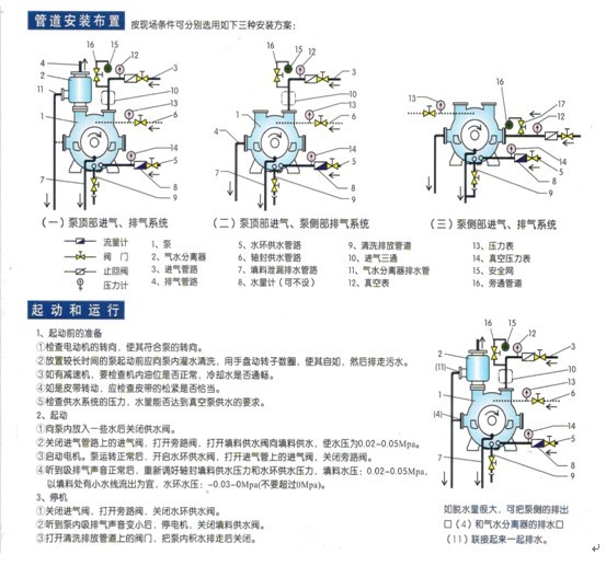 結構設計完善:裝有柔性閥板的排氣口,保證了工作過程的平穩(wěn);配有自動排水閥,避免超液位起動;當加裝防汽蝕裝置時,可以防止較高真空運行時的汽蝕損害;加裝噴淋裝置時,可以使高溫氣體在進入泵前作充分的降溫收縮,增加泵的抽氣能力。