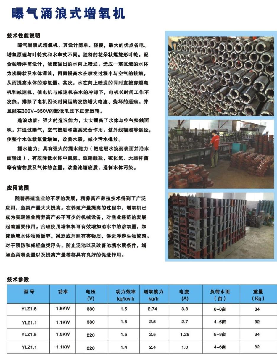 曝氣涌浪式增氧機(jī)是目前水產(chǎn)養(yǎng)殖增氧設(shè)備中新的產(chǎn)品,其設(shè)計(jì)大的優(yōu)點(diǎn)是省電。增氧原理與葉輪式和水車式不同,獨(dú)特的花朵狀螺旋形葉輪配合環(huán)形浮筒,能使輸出的水向上噴發(fā),造成一定區(qū)域的水體為沸騰狀,因而提高水體在噴發(fā)過程中與空氣的接觸,從而提高水體的溶氧量。同時(shí)水在向上噴發(fā)時(shí)直接穿越電機(jī)和減速機(jī),使電機(jī)與減速機(jī)在水的冷卻下實(shí)現(xiàn)長時(shí)間工作不發(fā)熱,排除了電機(jī)因長時(shí)間運(yùn)轉(zhuǎn)導(dǎo)致的發(fā)熱、電流增大、燒壞的通病,并且能在300—350瓦的超低電壓下正常運(yùn)轉(zhuǎn)。