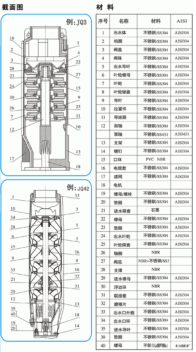 1、主機:不銹鋼潛水泵和潛不銹鋼水電機。