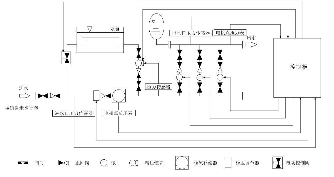 設備能在用水高峰時自動切換到水箱吸水若干小時,以保證水箱的水一天的循環(huán)。
