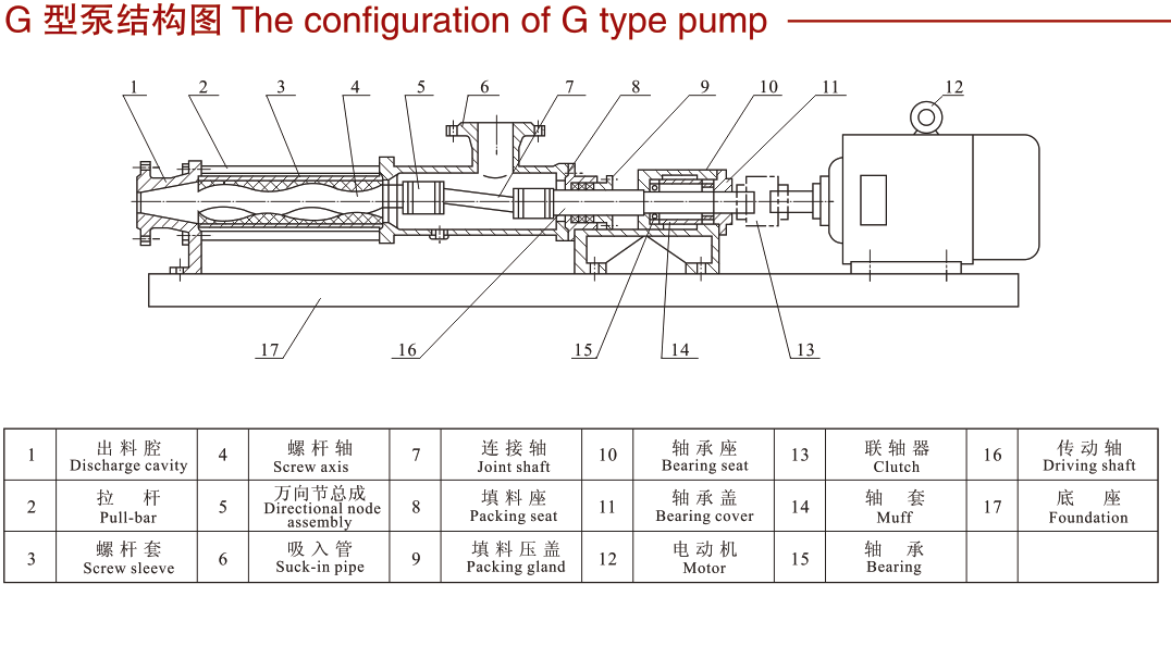G型單螺桿泵是按迥轉(zhuǎn)嚙合容積式原理工作的新型泵種,主要工作部件是偏心螺桿(轉(zhuǎn)子)和固定的襯套(定子)。由于該二部件的特殊幾何形狀,分別形成單獨的密封容腔,介質(zhì)由軸向均勻推行流動,內(nèi)部流速低,容積保持不變,壓力穩(wěn)定,因而不會產(chǎn)生渦流和攪動。每級泵的輸出壓力為0.6Mpa,揚程60m(清水),自吸高度一般在6m,適用于輸送介質(zhì)溫度80℃以下(特殊要求可達(dá)150℃)。因定子選用多種彈性材料制成,所以這種泵對高粘度流體的輸送和含有硬質(zhì)懸浮顆粒介質(zhì)或含有纖維介質(zhì)的輸送,有一般泵種所不能勝任的特點。其流量與轉(zhuǎn)速成正比。傳動可采用聯(lián)軸器直接傳動,或采用調(diào)速電機,三角帶,變速箱等裝置變速。這種泵零件少,結(jié)構(gòu)緊湊,體積小,維修簡便,轉(zhuǎn)子和定子是本泵的易損件,結(jié)構(gòu)簡單,便于裝拆。