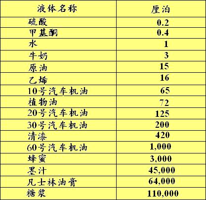 常見物質(zhì)流體近似粘度表