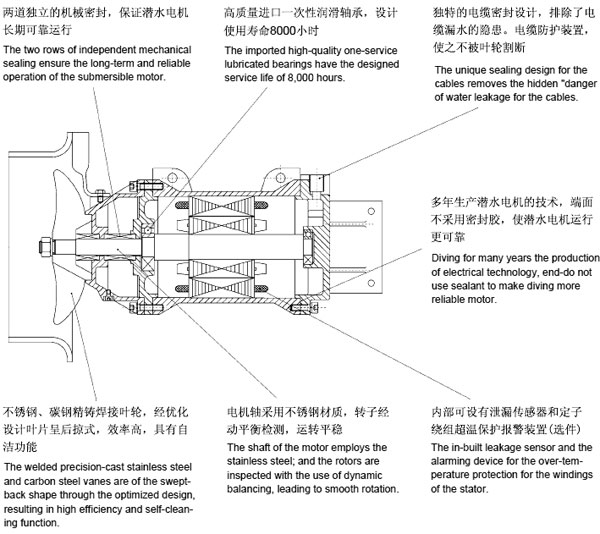 QJB型潛水?dāng)嚢铏C(jī)作為水處理工藝中的關(guān)鍵設(shè)備之一,在水處理工藝流程中,可實(shí)現(xiàn)生化過(guò)程中固液二相流和固液氣三相流的均質(zhì),流動(dòng)的工藝要求。它由潛水機(jī)葉輪和安裝系統(tǒng)等組成。潛水?dāng)嚢铏C(jī)為直連式結(jié)構(gòu)。他于傳統(tǒng)的大功率電機(jī)通過(guò)減速機(jī)降速相比,具有結(jié)構(gòu)緊湊,能耗低,便于維護(hù)和保養(yǎng)等有點(diǎn)。葉輪經(jīng)過(guò)精鑄或沖壓成型,精度高,推力打,流線性造型簡(jiǎn)潔美觀。該系列產(chǎn)品適用于需要固液攪拌,混合的場(chǎng)所。結(jié)構(gòu)簡(jiǎn)圖如下: