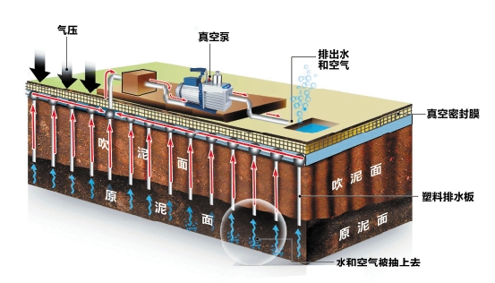 在一片泥漿里,記者看到一塊像水稻田一般的泥地,上面已經(jīng)被鋪上了一層密封膜,密封膜由真空膜、無紡布、濾管網(wǎng)、編織布組成,排水板被密密麻麻插進(jìn)泥里,一直深入原泥層,邊上是一臺(tái)真空泵,將軟泥里的空氣和水通過排水管排出地面,再利用大氣壓強(qiáng)把泥面壓結(jié)實(shí)!斑@是10畝試驗(yàn)區(qū),試驗(yàn)成功后,再到A1區(qū)3800畝試驗(yàn),一塊一塊壓!睆埿蹓颜f,這個(gè)過程很慢,要慢慢壓,把里面的水和空氣都排出來,需要90天左右,因?yàn)槟嗝鏁?huì)慢慢下沉,因此一般軟基處理前,泥面會(huì)高出地面1.2米左右。密封很重要,因此看起來不起眼的膜都是特制的,要特別堅(jiān)韌、防老化,而且一塊就有1.5萬平方米。