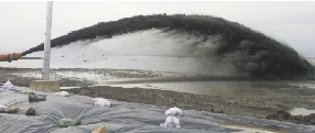 首先,泥漿通過管道被“吹”到填海區(qū)。◤堝 攝)