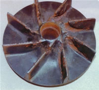 (1)汽蝕現(xiàn)象 對(duì)如右圖所示的入口管線,在0-0(位能基準(zhǔn)面)和K-K間列柏努利方程,得: 在貯槽液面上方壓力p0一定的情況下,若增加泵的安裝高度ZK(即Hg),則葉輪中心K處的壓力pK必然下降。當(dāng)ZK增加到使pK下降至被輸送液體在操作溫度下的飽和蒸汽壓時(shí),則被輸送流體在葉輪中心處發(fā)生汽化,產(chǎn)生大量汽泡;汽泡在由葉片中心向周邊運(yùn)動(dòng)時(shí),由于壓力增加而急劇凝結(jié),產(chǎn)生局部真空,周圍液體以很高的流速?zèng)_向真空區(qū)域;當(dāng)汽泡的冷凝發(fā)生在葉片表面附近時(shí),眾多液滴尤如細(xì)小的高頻水錘撞擊葉片。此種現(xiàn)象稱作“汽蝕現(xiàn)象”。 離心泵在汽蝕狀態(tài)下工作時(shí),泵體振動(dòng)并發(fā)出噪音;壓頭、 流量大幅下降,嚴(yán)重時(shí)不能輸送液體;時(shí)間長(zhǎng)久,在水錘沖擊和液體中微量溶解氧對(duì)金屬化學(xué)腐蝕的雙重作用下,葉片表面出現(xiàn)斑痕和裂縫,甚至呈海綿狀逐漸脫落(見右圖)。 通過以上討論可以看出,安裝高度過高將會(huì)導(dǎo)致葉輪中心處的壓力過低,從而發(fā)生汽蝕。只要泵的實(shí)際安裝高度低于允許安裝高度,則操作時(shí)就可避免發(fā)生汽蝕現(xiàn)象。