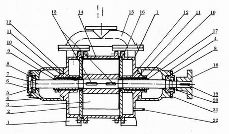9. 后軸套10.填料壓圈 11.填料 12.填料壓圈 13.平鍵 14.泵體 15.連通管 16.前吸排氣園盤 17.前軸套 18.聯(lián)軸器具 19.平鍵 20.園螺母 21.前軸承壓蓋