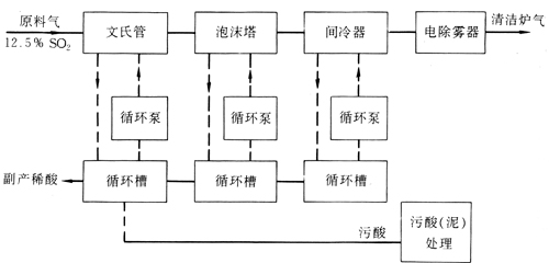 酸洗凈化工藝流程如圖1所示,是利用含H2SO4約10%-30%的稀酸作為循環(huán)吸收液對含有雜質(zhì)的爐氣進(jìn)行凈化。與水洗凈化相比,其優(yōu)點是可以實現(xiàn)凈化過程中的封閉循拜操作,可以大限度地減少有害物質(zhì)排放,減少環(huán)境污染,還可以副產(chǎn)部分稀酸。