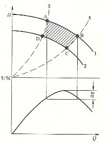 離心泵性能曲線圖上每個點對應(yīng)一個工況,離心水泵在高效率點工作是理想的,但這一要求并不現(xiàn)實,一般是規(guī)定一個工作范圍,如圖2 4中的曲線1巾的AB段,在此范圍內(nèi)泵運行的效率下降不大。通過改變轉(zhuǎn)速或切割葉輪也叫擴大泵的運行機制范圍,曲線2即是改變轉(zhuǎn)速或切割葉輪前后的特性曲絨.曲線3、4是改變轉(zhuǎn)速速的相似拋物線或是切割外徑的切割線(拋物線)。方塊ABCD稱為泵擴大r的工作范圍,泵町以在此范同的任·點工作,而且效率下降多不會超過5%~8%。把許多泵的工作范圍畫在一張坐標(biāo)圖中.稱為型譜。為了使圖形協(xié)調(diào).高揚程和大流量時的工作范圍不致過大(因高揚程大流量的工作范圍相對變大),通常采用對數(shù)坐標(biāo)表示。一般每種系列泵有一個型譜。