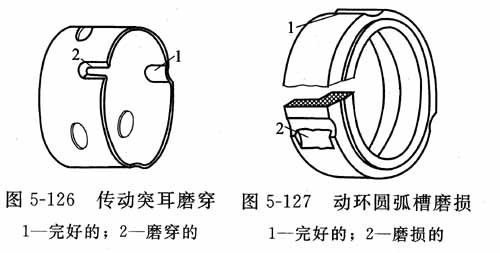 與傳動(dòng)座突耳接觸的動(dòng)環(huán)圓弧槽也產(chǎn)生相應(yīng)的磨損,見(jiàn)圖5-127,原因同上。
