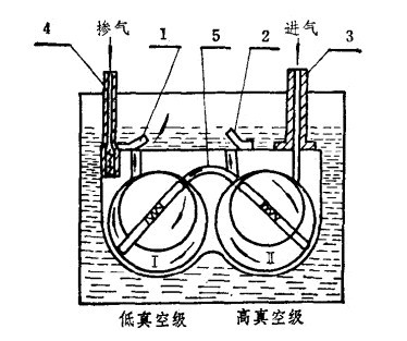 ![]() 圖2雙級(jí)泵的工作原理 1.低真空級(jí)排氣閥2.高真空級(jí)排氣閥3.進(jìn)氣管4.摻氣閥5.中間通道 |