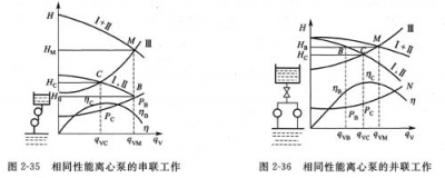 這表明,兩臺離心泵串聯(lián)工作時所產(chǎn)生的總揚程HM小于泵單獨工作時揚程的兩倍,大于串聯(lián)前單獨運行的揚程Hc,而串聯(lián)后流量比一臺泵單獨工作時大,這是因為泵串聯(lián)后,雖然它的揚程成倍增加,但管路的阻力損失并沒有成倍增加,故富裕的揚程使流量有所增加。