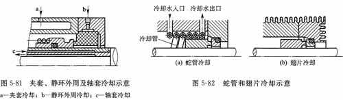 ①間接冷卻  間接冷卻有密封腔夾套冷卻、靜環(huán)外周冷卻、軸套冷卻和換熱器冷卻等方式。換熱器冷卻中有離心泵密封腔內(nèi)置式換熱器和外置式冷卻器、蛇(盤)管冷卻器、套管冷卻器、翅片冷卻器以及缺水地帶用的蒸發(fā)冷卻器。常用的傳熱介質(zhì)是水、蒸汽和空氣。圖5-81和圖5-82為幾種間接冷卻的示意圖。