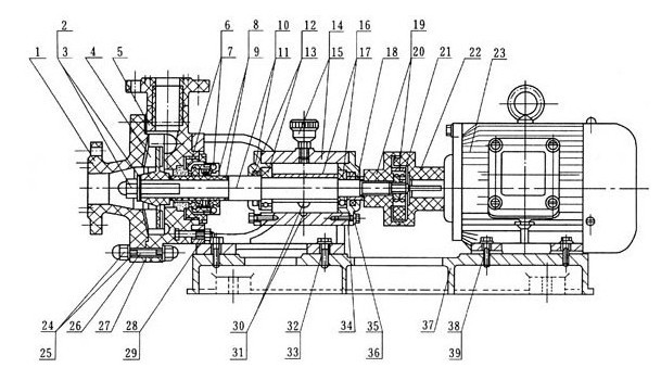 6、如果更換滾珠軸承或泵軸時(shí),必須折下機(jī)架,松開前端軸承蓋4只螺釘,折下泵軸后端園螺母和聯(lián)軸節(jié),將泵軸向前端方向打出即可,再后折下后端軸封蓋。