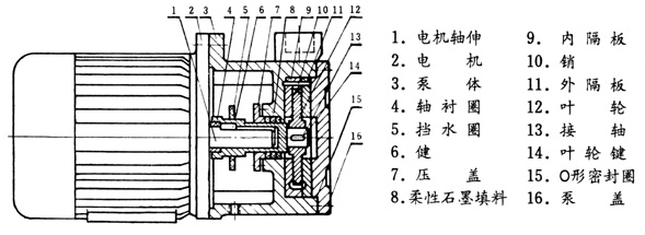 本泵采用泵與電機(jī)直聯(lián)結(jié)構(gòu),其進(jìn)水口為水平方向,吐出口垂直向上。 從泵端看,泵為逆時(shí)針轉(zhuǎn)動(dòng)。 葉輪可在懸臂軸上自由滑動(dòng),運(yùn)轉(zhuǎn)時(shí)能自動(dòng)調(diào)正葉輪二面的間隙,外隔板可借助于葉輪上的二螺孔與葉輪一起拆出葉輪,內(nèi)隔板采用9-4鋁鐵青銅,軸采用不銹鋼,填料采用新型密封材料柔性石墨。 本泵性能穩(wěn)定,結(jié)構(gòu)得意,拆裝方便。