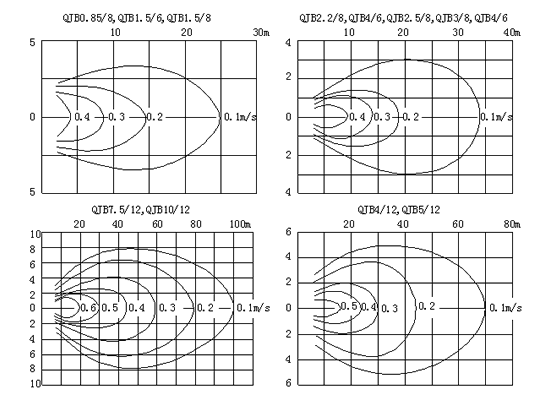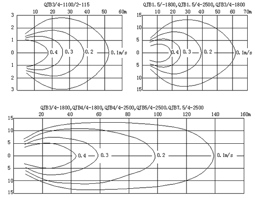 潛水?dāng)嚢铏C的選型是一項比較復(fù)雜的工作,選型的正確與否直接影響設(shè)備的正常使用,作為選型的原則就是要讓潛水?dāng)嚢铏C在適合的容積里發(fā)揮充分的攪拌功能,一般可用流速來確定。根據(jù)污水處理廠不同的工藝要求,潛水?dāng)嚢铏C佳流速應(yīng)保證在0.15~0.3m/s之間,如果低于0.15m/s的流速則達不到推流攪拌效果,超過0.3m/s的流速則會影響工藝效果且造成浪費。所以在選型前首先確定QJB潛水?dāng)嚢铏C運用的場所,如:污水池、污泥池、生化池;其次是介質(zhì)的參數(shù),如:懸浮物含量、粘度、溫度、PH值;還有水池的形狀、水深甚至安裝方式等都對選型產(chǎn)生影響,同時還應(yīng)考慮到節(jié)能因素,因為這將影響到用戶今后的運行成本?蓞⒖枷旅娴臐撍?dāng)嚢铏C流場圖。
