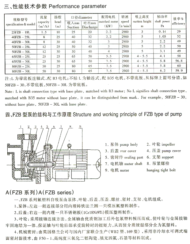1、我公司生產(chǎn)的FZB系列氟塑料自吸泵,適合于在-20度到100度溫度的條件下長期輸送濃度的任意介質(zhì):酸、氧化劑及腐蝕性介質(zhì)(禁輸快速硬質(zhì)結(jié)晶體介質(zhì)),過流部分全部采用氟塑料增強聚丙烯合成(聚四氟乙烯和聚全氟乙丙烯等多種氟材料經(jīng)過合理配方)模壓加工而成,它集多種氟塑料之優(yōu)點,具有特強的耐腐蝕性,機械強度高,不老化,無毒素分解等優(yōu)點。如輸送結(jié)晶、顆粒及懸浮物需告知我公司,以便安裝相應的密封。